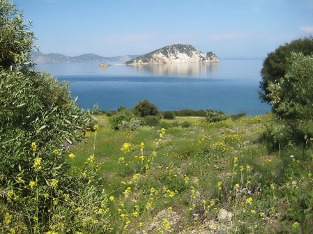 Keri Caves and the little island of Marathonissi (Turtle